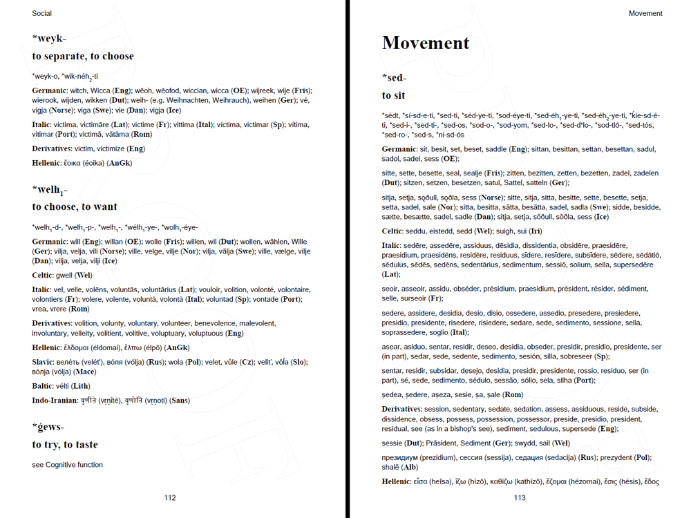 The dictionary consists of two parts. The first part contains the pages for each Proto-Indo-European word (the root word), showing cognates in the chosen languages plus various descendants and derivatives. These pages are arranged thematically, allowing you to browse or study. Search is enabled by the second part to the dictionary, which contains a separate index for each language, telling you where to find each word.