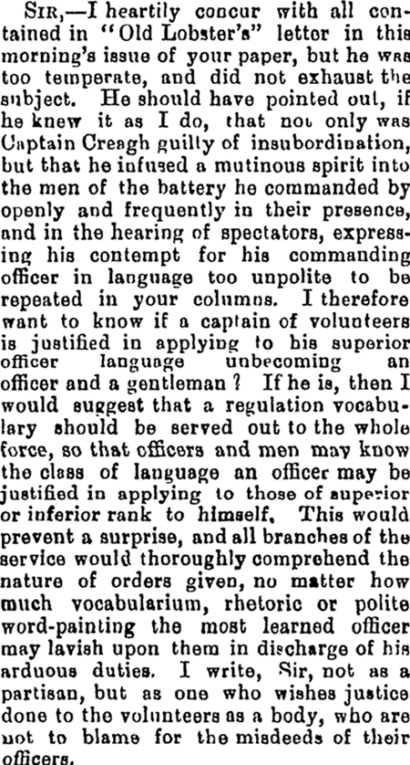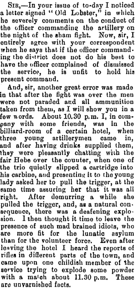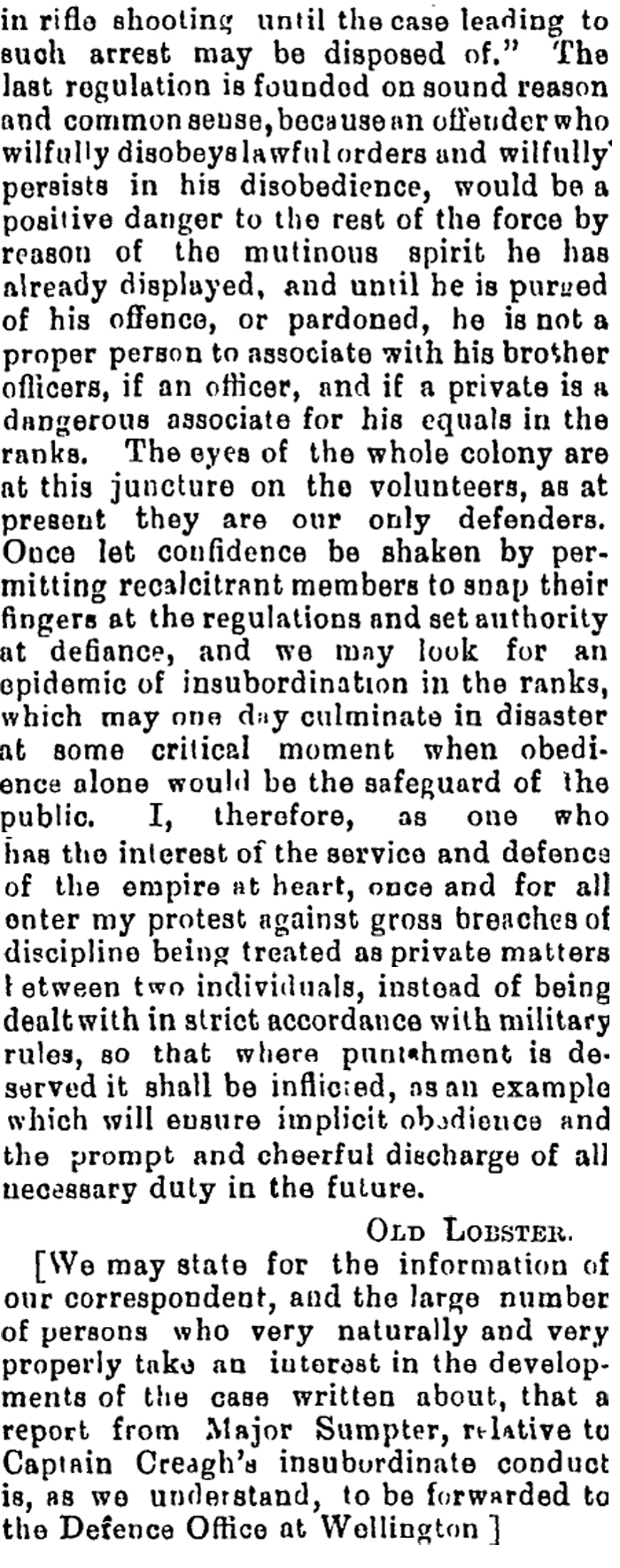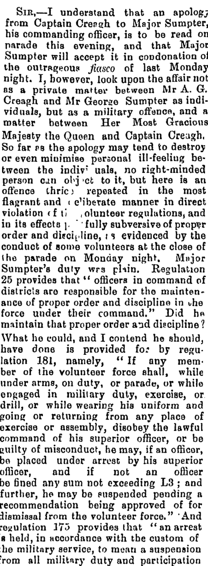 In Letters to Emma, I made passing reference to an incident in 1885, in which an officer in George's Volunteers displayed a level of insubordination that got some newspaper readers of the time quite incensed. Here below, with thanks and due acknowledgement to the wonderful Papers Past site from which these cuttings come, are some of these letters to the Editor. Click the image to enlarge.