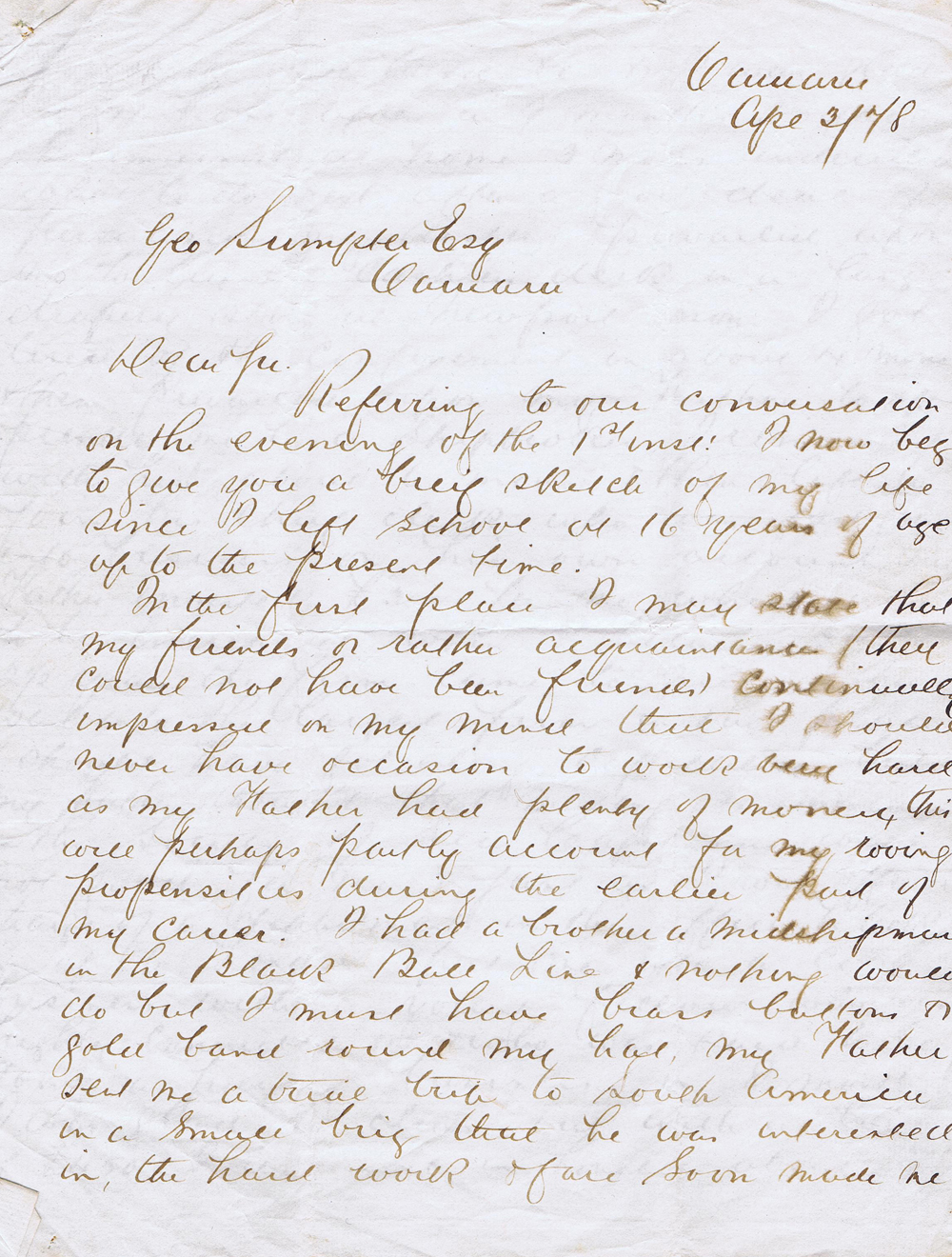 The first page of Richard's letter to George, in which he gives a very frank description of his previous career. He says at the end, "I may add that in giving you the foregoing information I have done what I would not do for any other man living". Presumably he did so because he wished to marry George's daughter, but it is astonishing that he didn't try to "pretty-up" his less than illustrious history! Click the letter to enlarge.